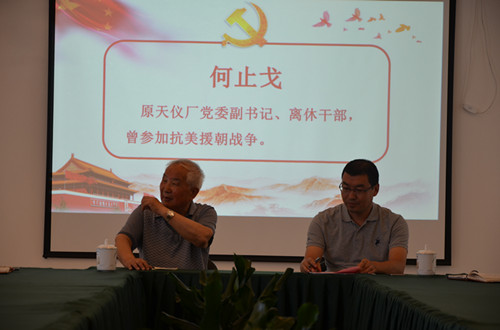 在黨的98歲生日這天,何止戈老同志以“不忘初心、牢記使命”為主題給大家講了一場生動形象的“故事黨課”。他闡述自己對“不忘初心”的理解,“不忘初心”是“不要忘了共產黨人的信仰,不要忘了入黨時候的初心、怎么說的,要踏踏實實做好自己的事。腦子里的信念不能變,要聽黨的話,跟黨走,黨讓干啥就干啥,干啥就要干好它。要時時刻刻記住自己黨員的身份,要積極發揮正能量,時刻發揮自己的作用。”他還結合自己參加抗美援朝以及參與籌備天儀廠建廠的經歷剖析了共產黨員如何永葆本色、保持先進,告誡黨員要堅定理想信念,堅守全心全意為人民服務的宗旨信仰,踐行自己的入黨誓言。