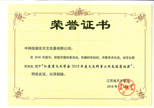 為了表彰在2018年度中積極開展科普活動、傳播科普知識、開展學術交流方面作出杰出貢獻的集體,天文學會頒發了2018年度科普工作先進集體獎,我公司獲此殊榮。會上,學會副理事長、中科院紫金山天文臺趙長印書記宣讀表彰決定,省科協學會學術部李政部長為我公司等5家獲獎單位頒獎。