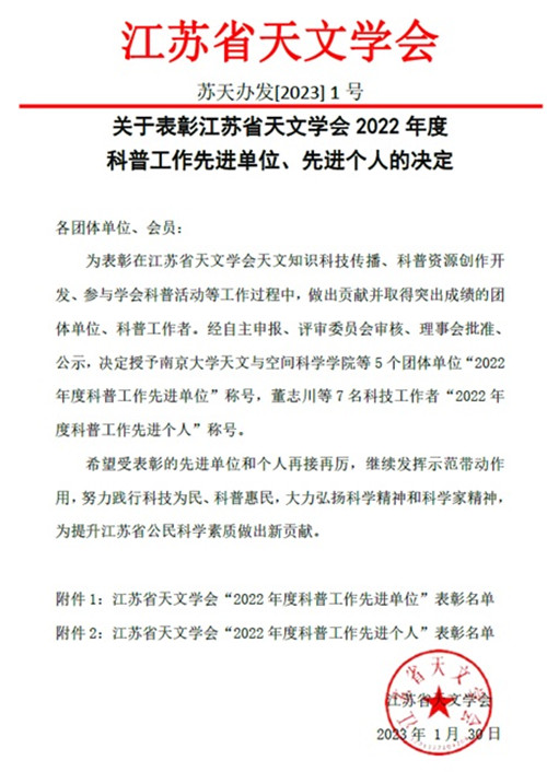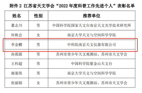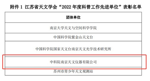 2023年1月30日,江蘇省天文學會發文,表彰了一批在天文知識科技傳播、科普資源創作開發、參與學會科普活動等工作過程中做出貢獻并取得突出成績的團體單位與科普工作者。南京天儀獲得2022年度科普工作先進單位稱號,研發中心李金鵬博士獲得“2022 年度科普工作先進個人”稱號。