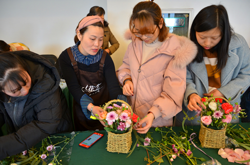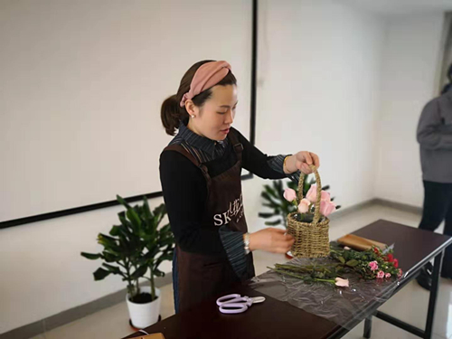 公司邀請花藝?yán)蠋煹焦緸榇蠹椰F(xiàn)場授課,她從如何修剪花枝、不同的花在花束中擺放的位置等插花知識和技巧講起,仔細(xì)地向大家講解了如何制作一籃層次分明、錯落有致的花束,并耐心為大家演示了插花的步驟和要領(lǐng)。浪漫粉色的玫瑰,高雅神秘的桔梗,零星點(diǎn)點(diǎn)的滿天星,還有各色花卉放滿了一桌。大家沉浸在自我創(chuàng)作、欣賞之中,忙得不亦樂乎。一枝花、一棵草,在她們的巧手下變得詩情畫意、清新怡人。大家全身心投入到活動中,認(rèn)真聆聽的同時,不時地跟老師探討,用心制作著屬于自己的花束。
