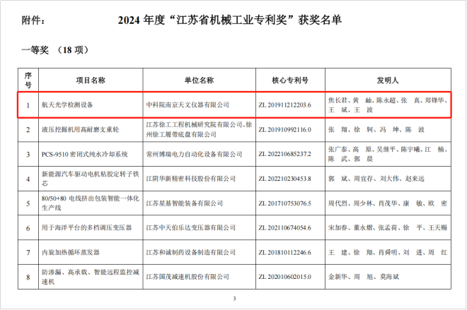 近日,江蘇省機械行業協會公布了2024年度“江蘇省機械工業專利獎”,其中一等獎18項、二等獎22項。我公司申報的“航天光學檢測設備”(核心專利號ZL 201911212203.6)榮獲一等獎并位列榜首。這是南京天儀在機械研發領域首次獲此殊榮,展示了公司雄厚的研發實力,體現出公司勇當科技創新國家隊的使命與擔當。????